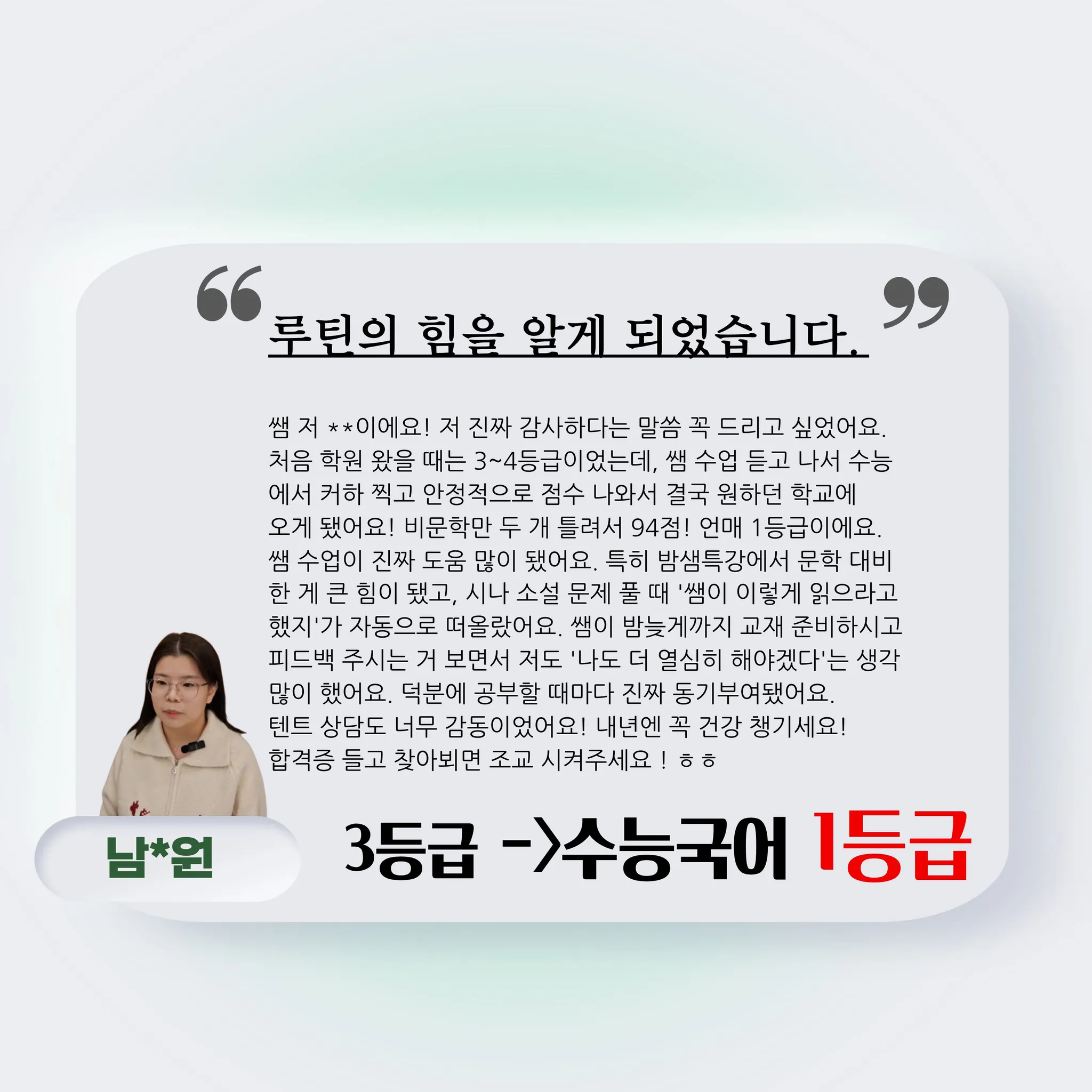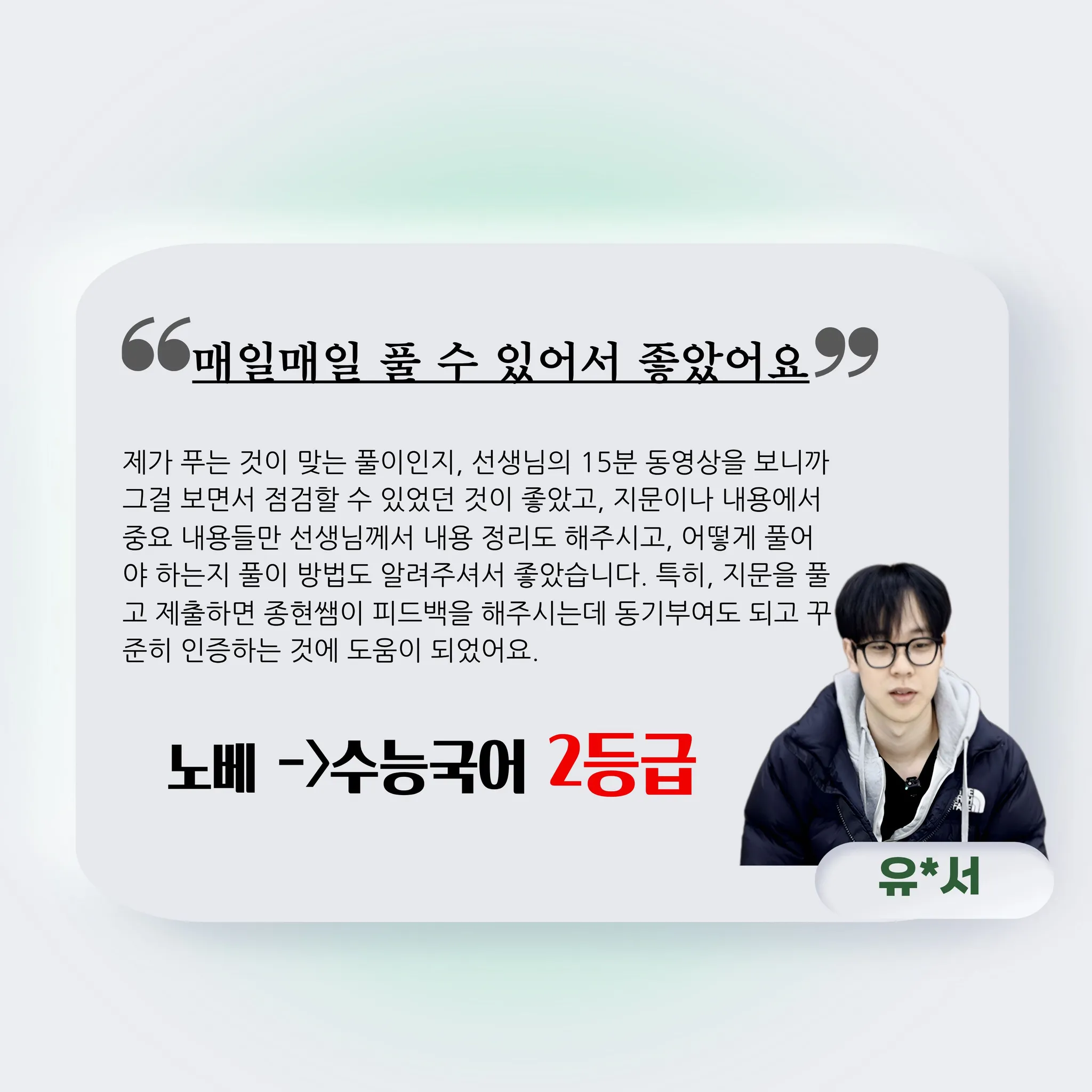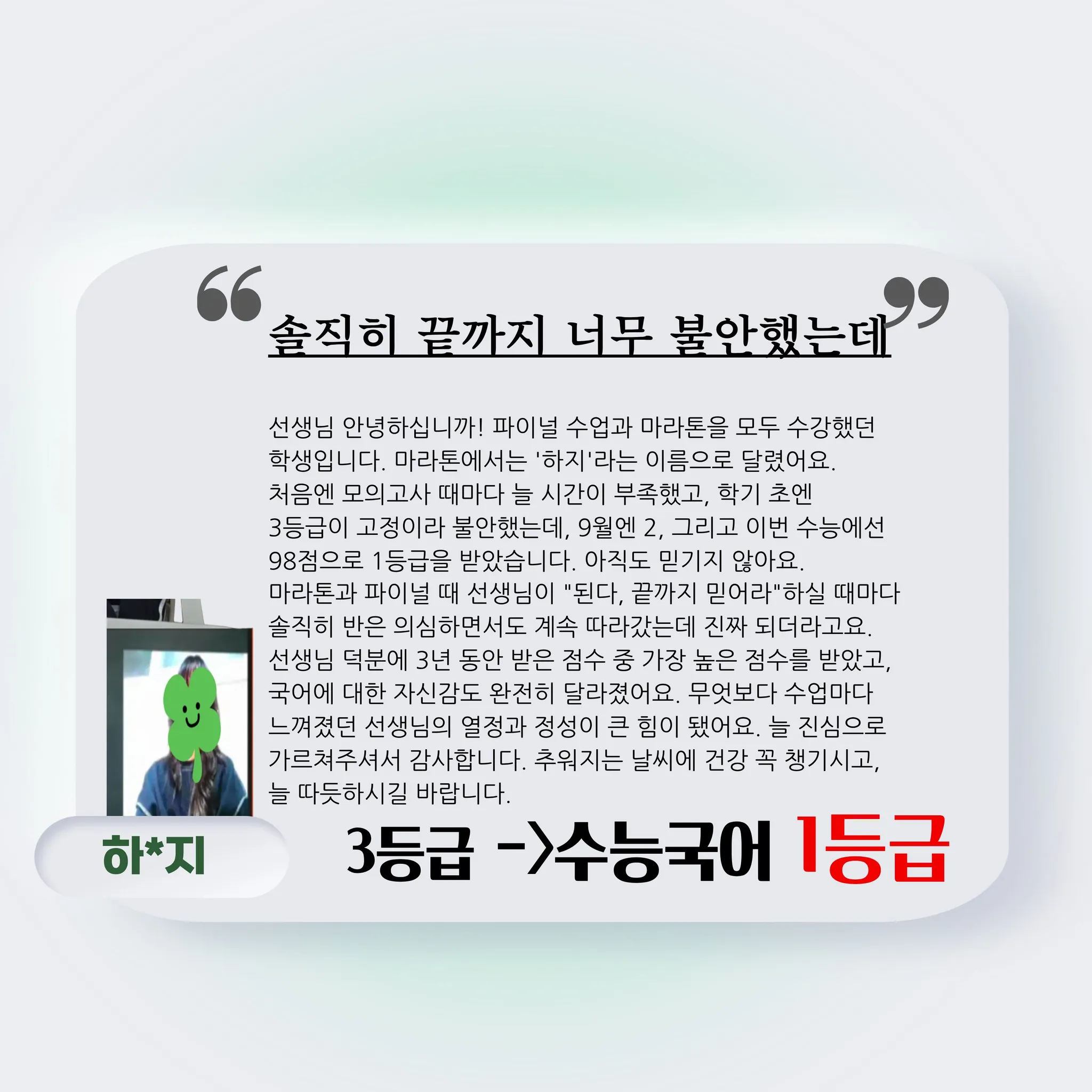 마라톤과 파이널 때 선생님이 “된다, 끝까지 믿어라”하실 때마다 솔직히 반은 의심하면서도 계속 따라갔는데 진짜 되더라고요. 선생님 덕분에 3년 동안 받은 점수 중 가장 높은 점수를 받았고, 국어에 대한 자신감도 완전히 달라졌어요. 무엇보다 수업마다 느껴졌던 선생님의 열정과 정성이 큰 힘이 됐어요. 늘 진심으로 가르쳐주셔서 감사합니다. 추워지는 날씨에 건강 꼭 챙기시고, 늘 따듯하시길 바랍니다.