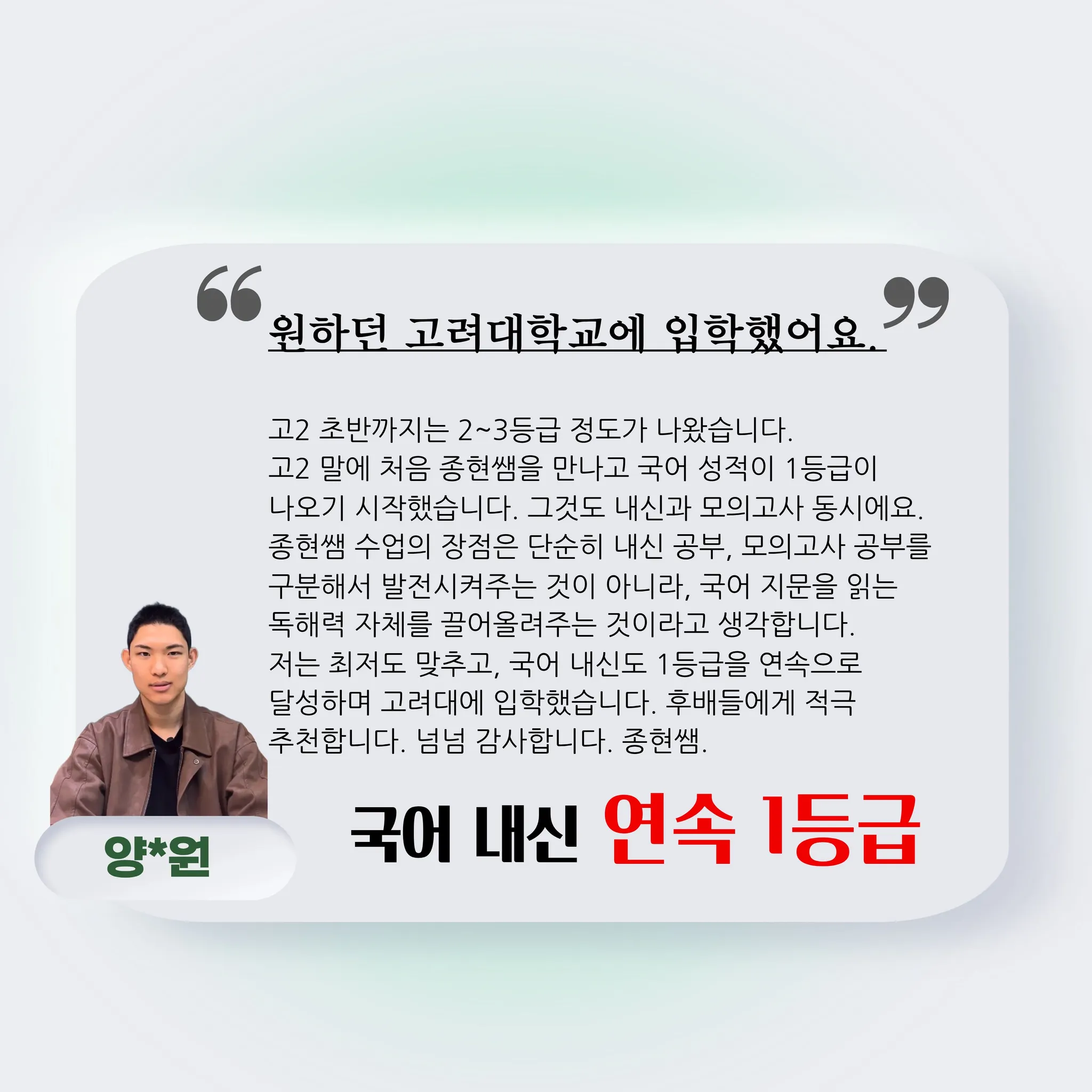 달성하며 고려대에 입학했습니다. 후배들에게 적극 추천합니다. 넘넘 감사합니다. 종현쌤.