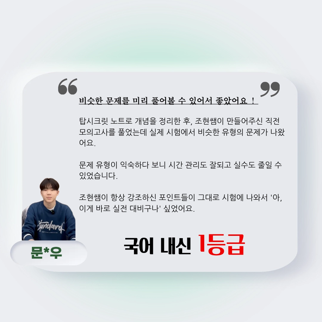 조현쌤이 항상 강조하신 포인트들이 그대로 시험에 나와서 '아, 이게 바로 실전 대비구나' 싶었어요.