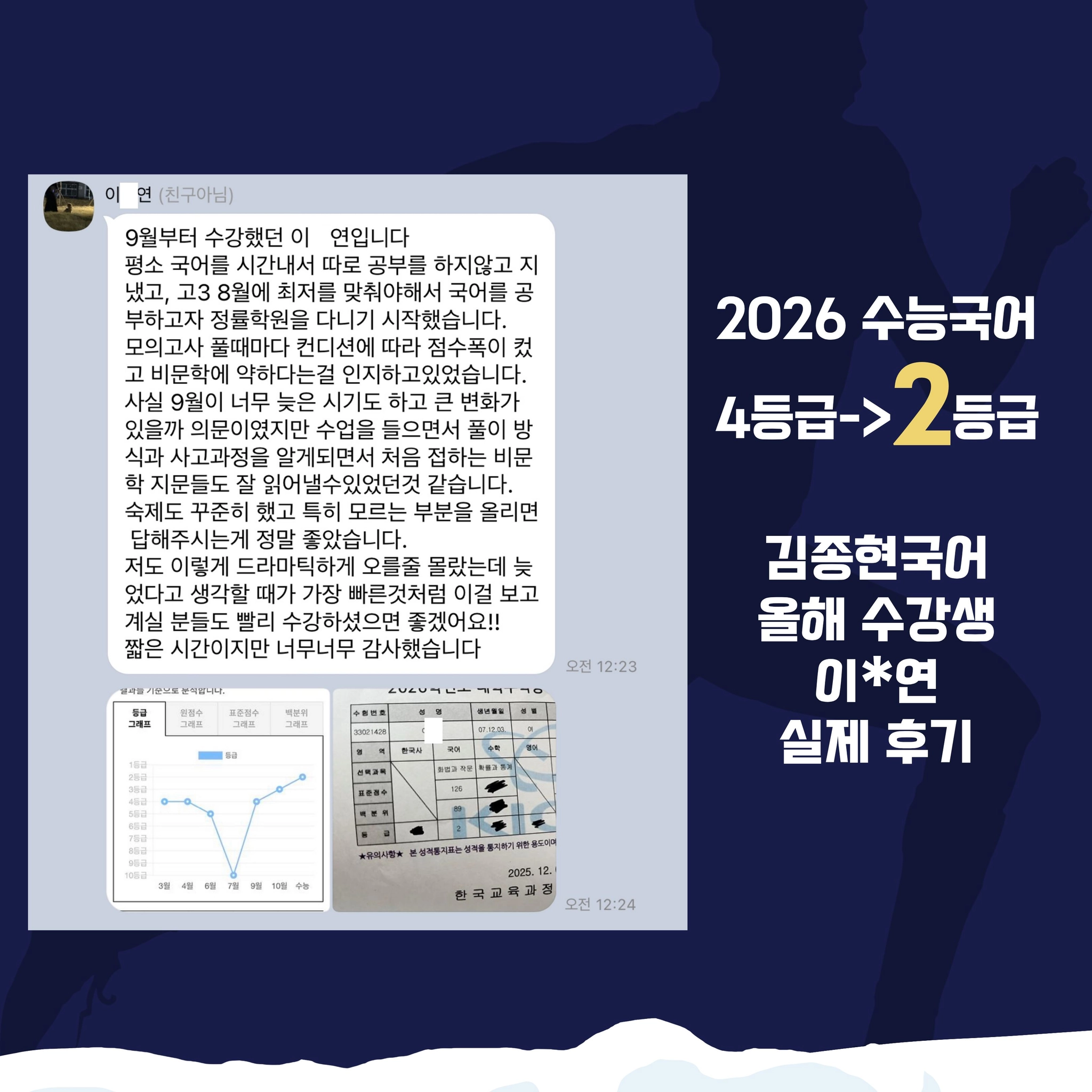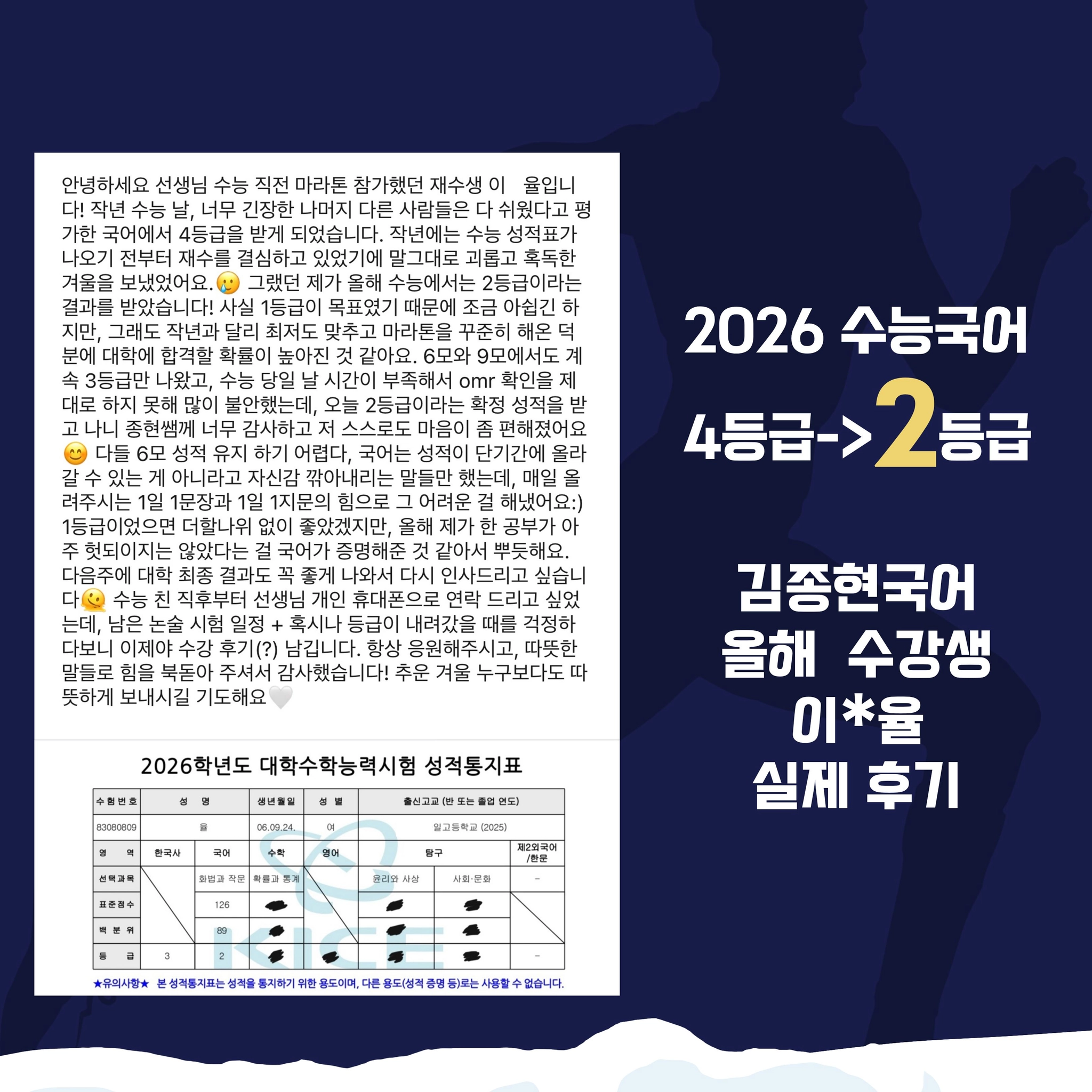 ■ 성적 : 작년수능 4등급에서 2026 수능국어 2등급 달성