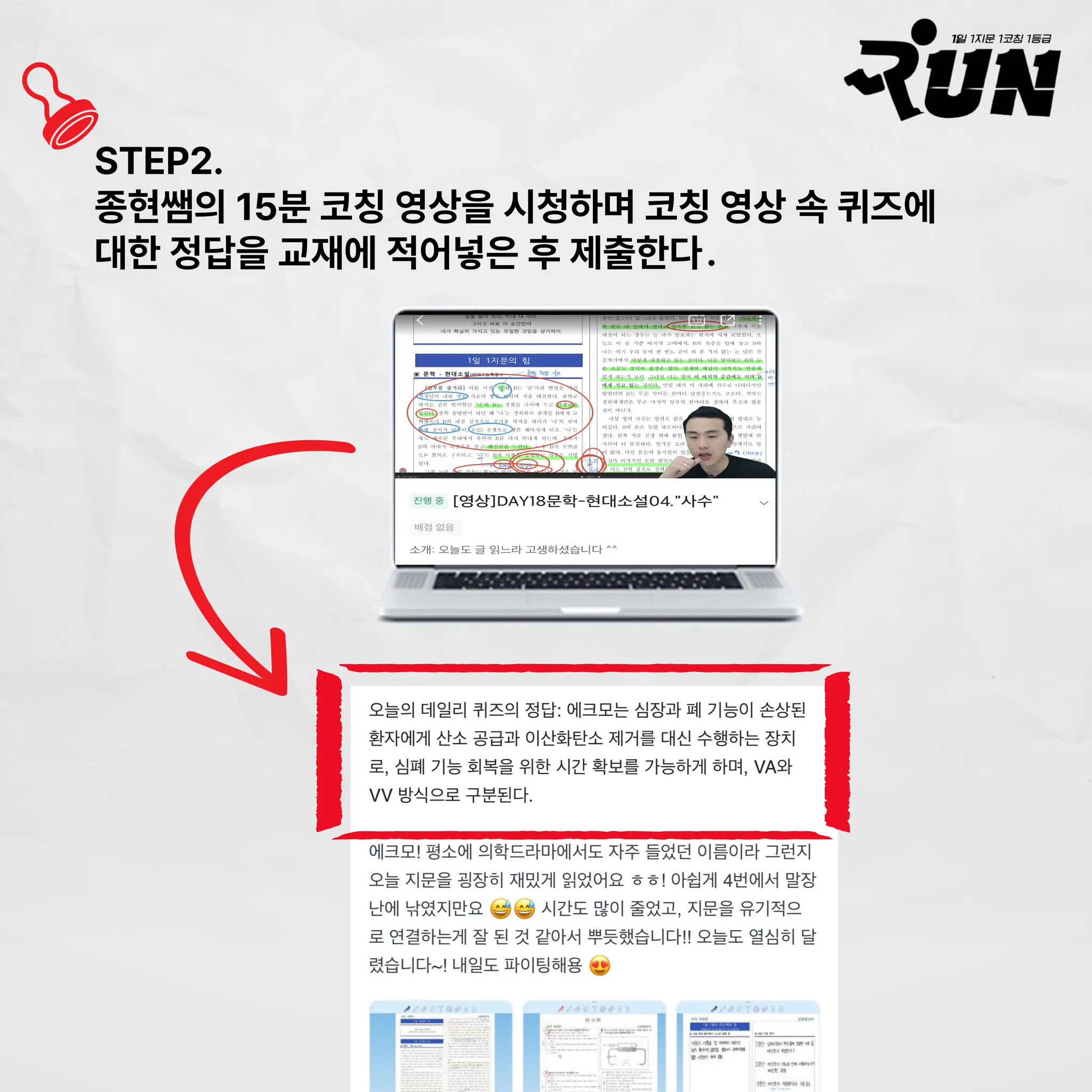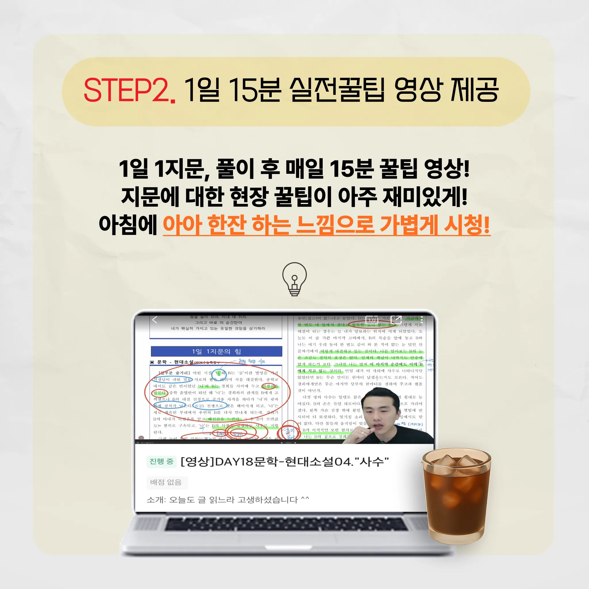 2) 지문 풀이 후 종현쌤의 15분 코칭 영상을 시청하며 데일리 퀴즈를 풀이합니다.
