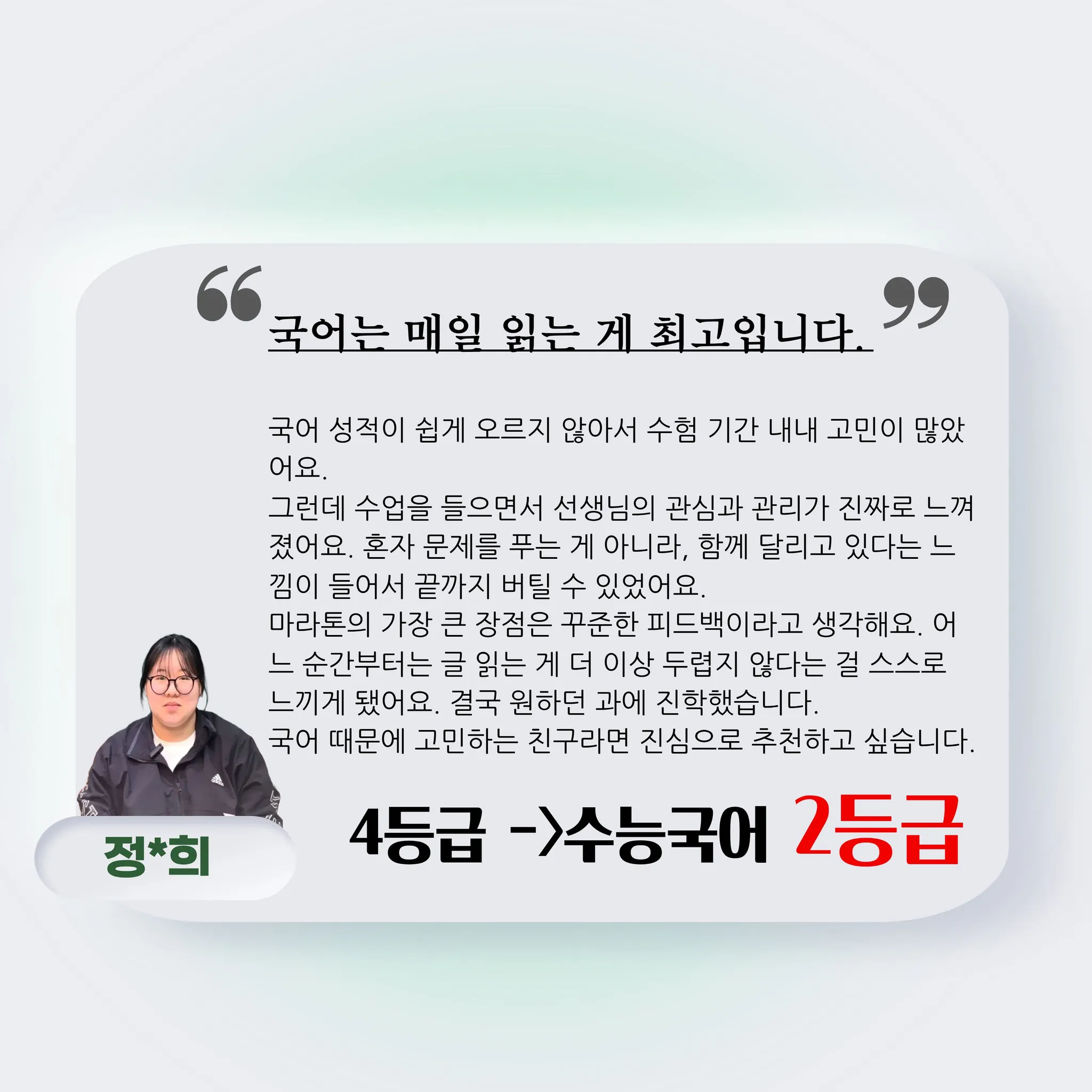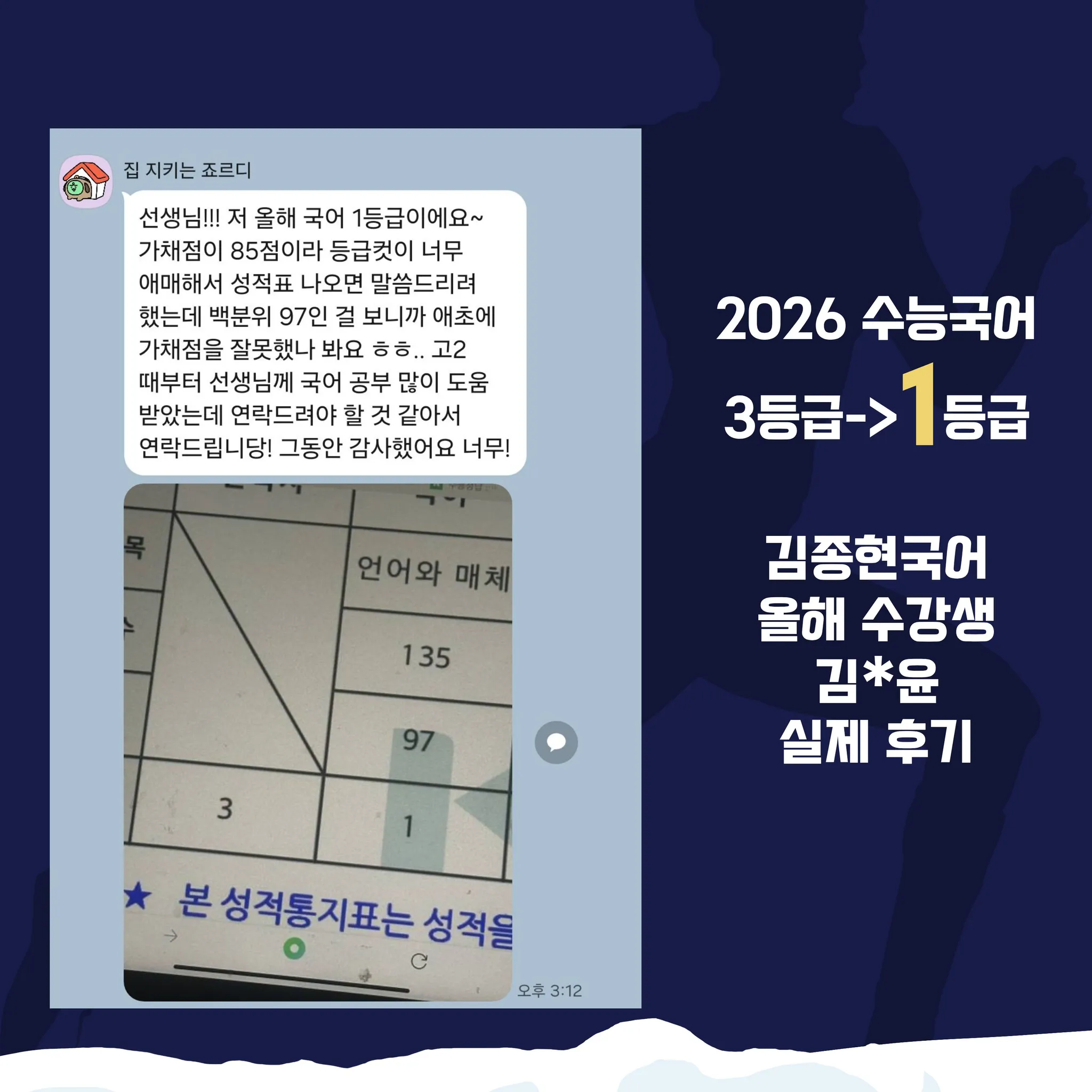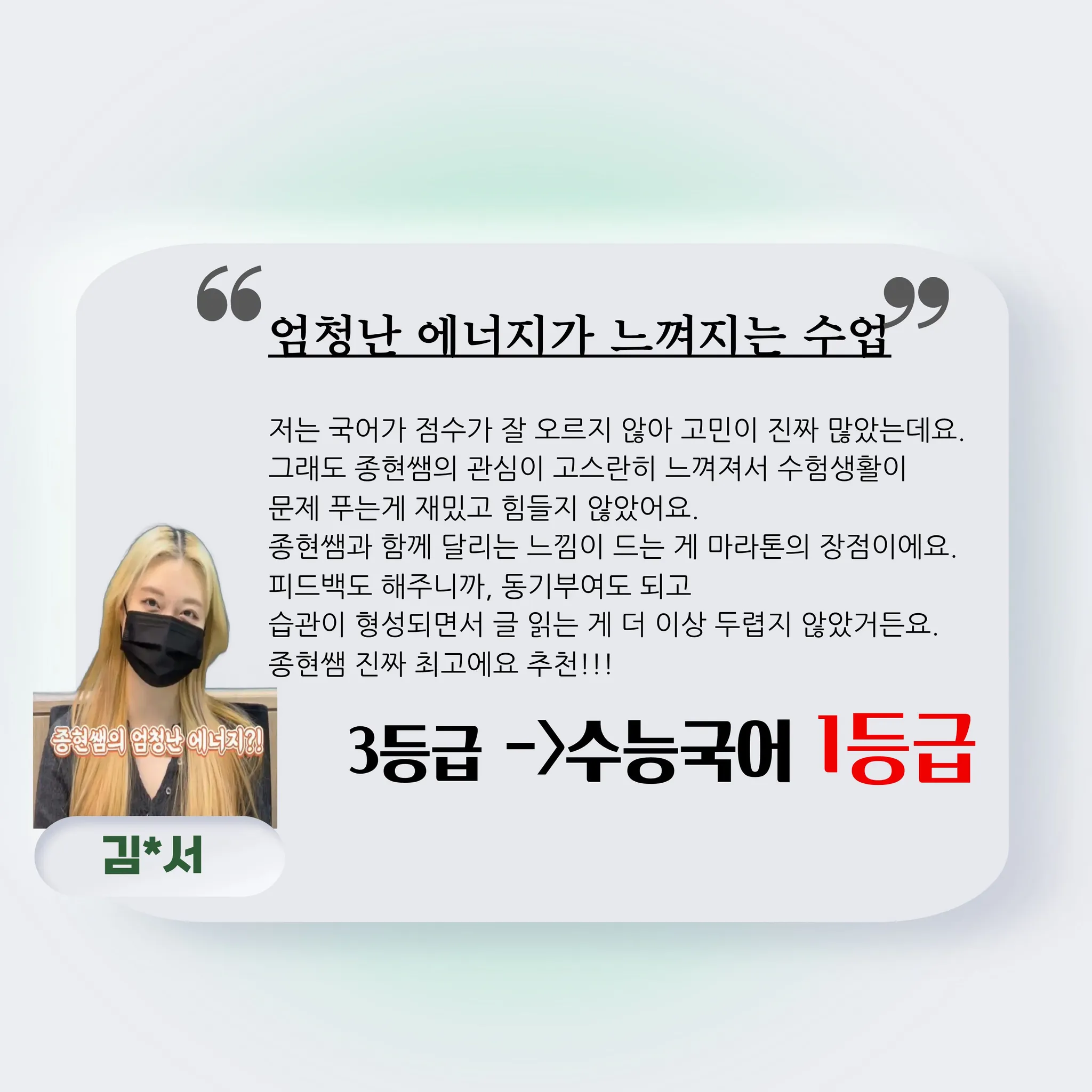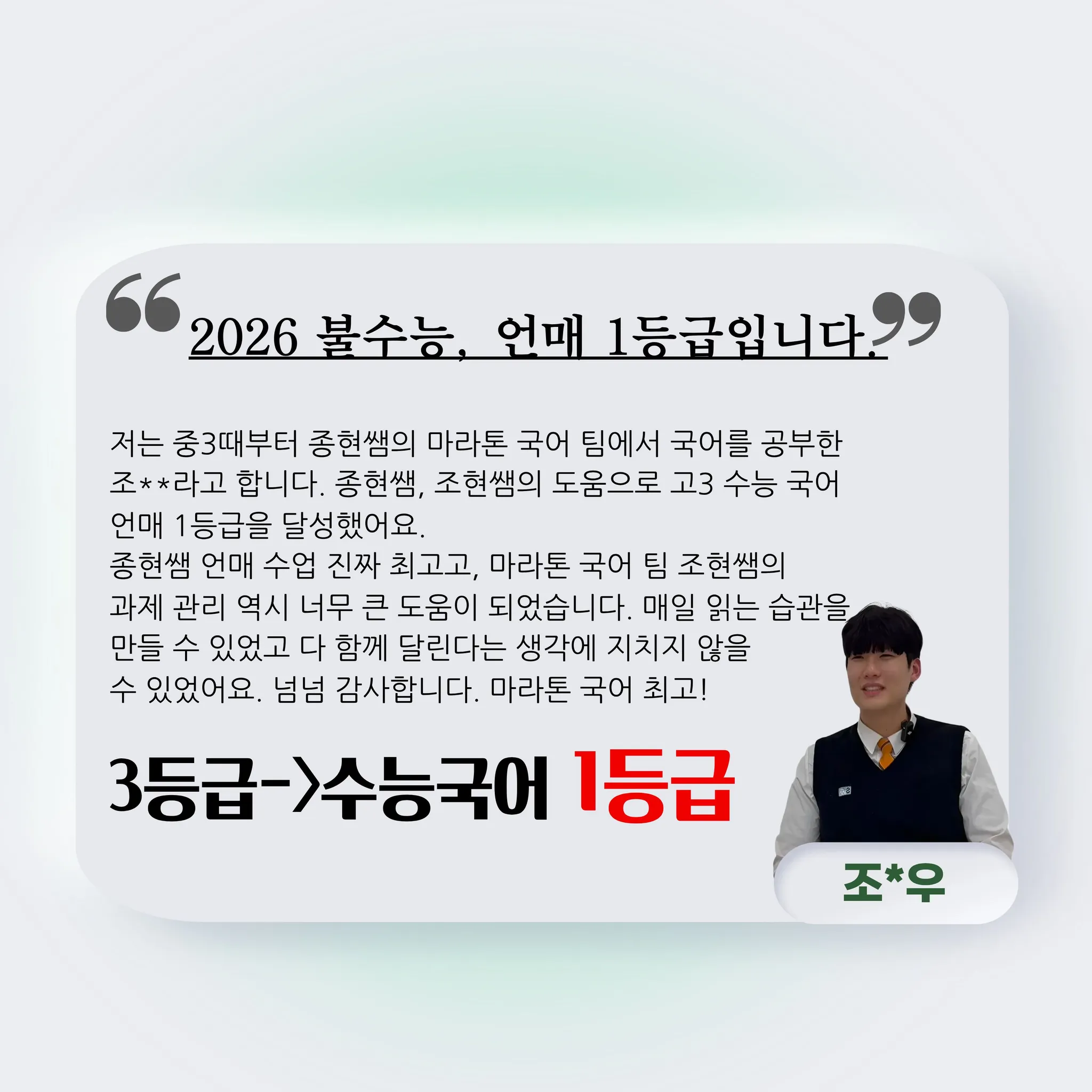 저는 중3때부터 종현쌤의 마라톤 국어 팀에서 국어를 공부한 조**우라고 합니다. 종현쌤, 조현쌤의 도움으로 고3 수능 국어 언매 1등급을 달성했어요.