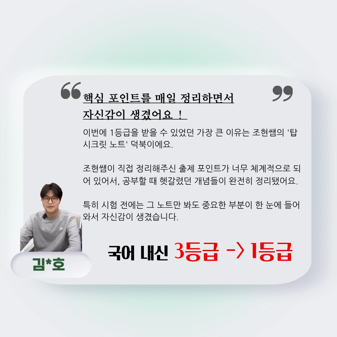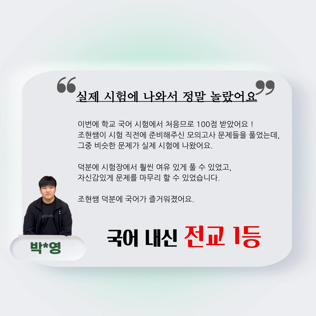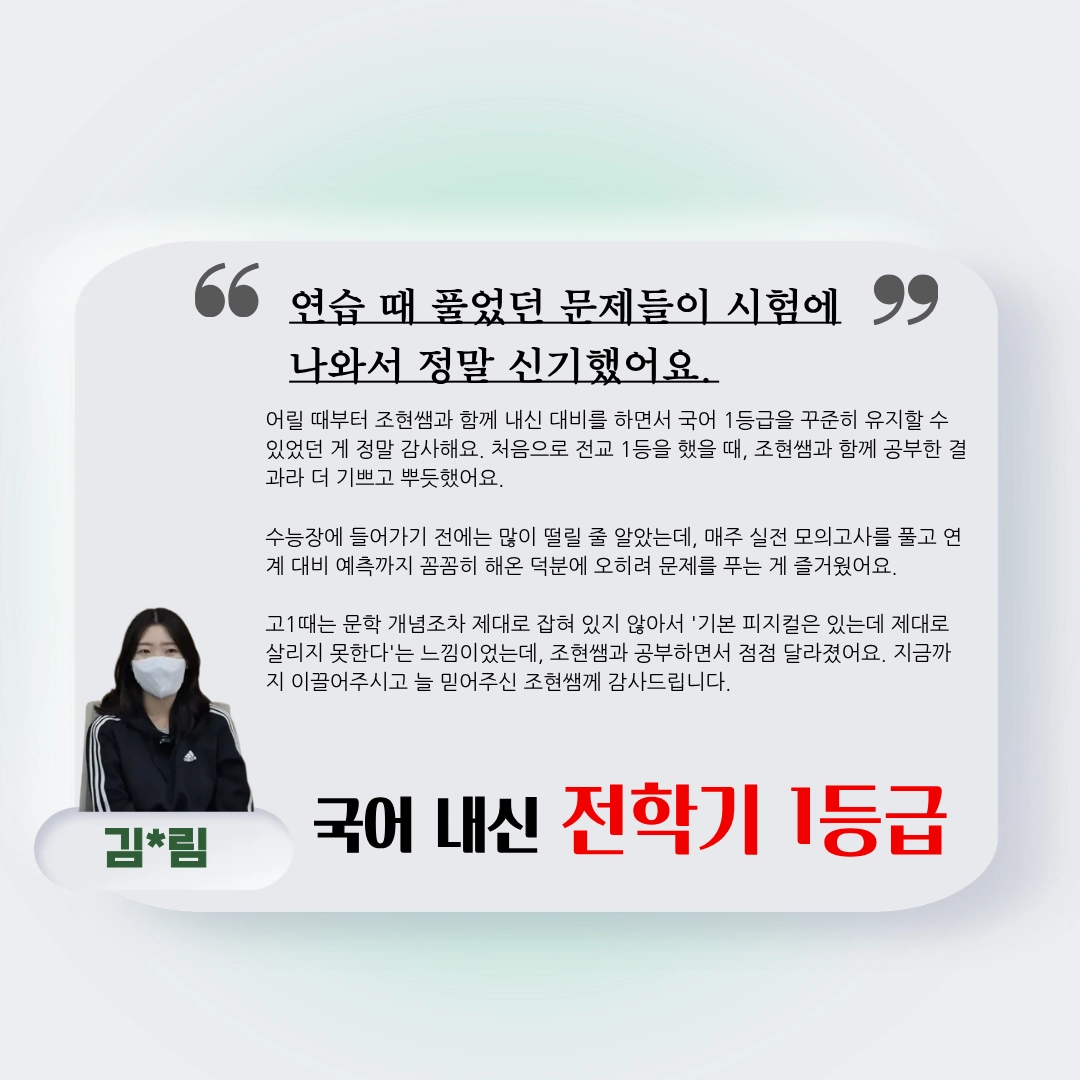 어릴 때부터 조현쌤과 함께 내신 대비를 하면서 국어 1등급을 꾸준히 유지할 수 있었던 게 정말 감사해요. 처음으로 전교 1등을 했을 때, 조현쌤과 함께 공부한 결과라 더 기쁘고 뿌듯했어요.