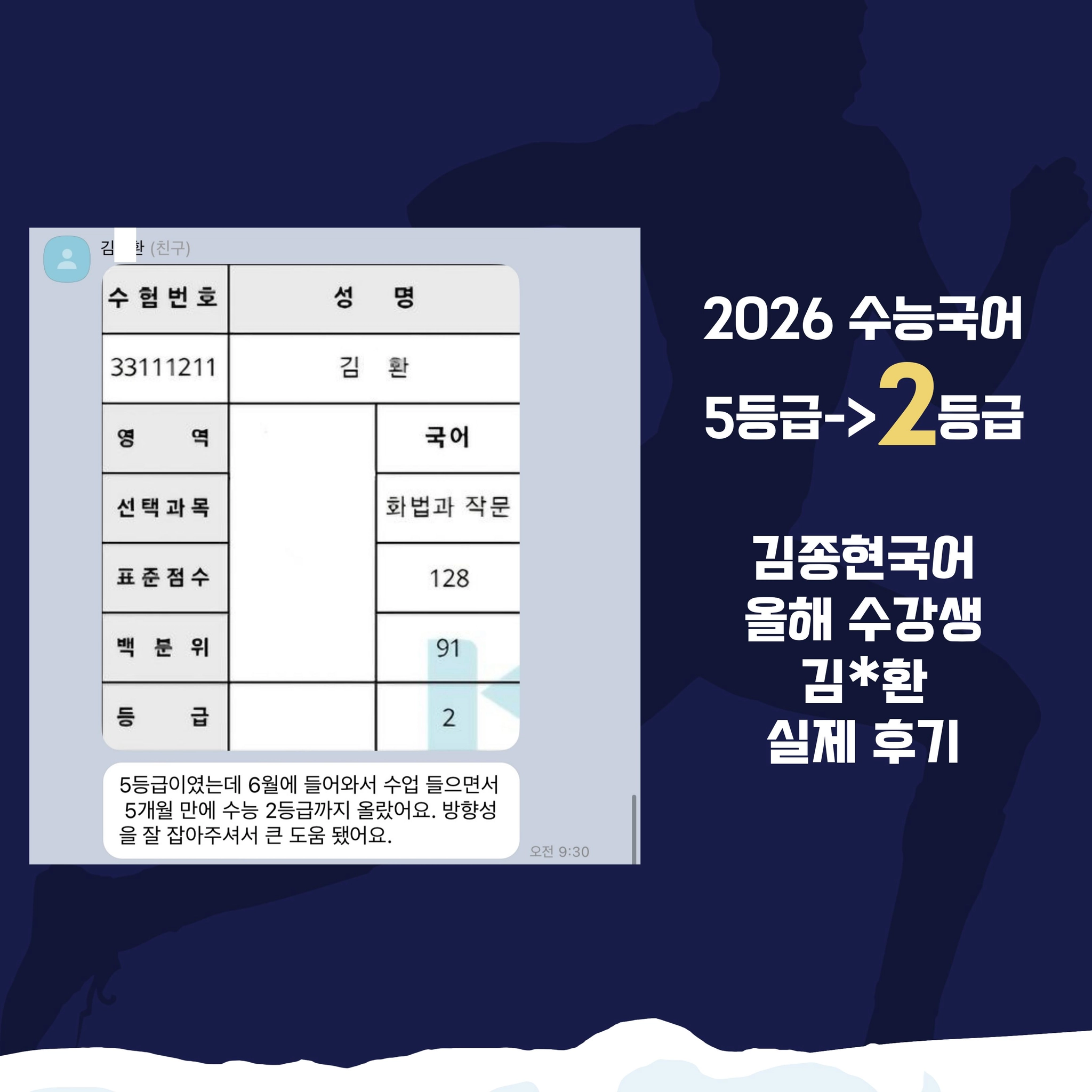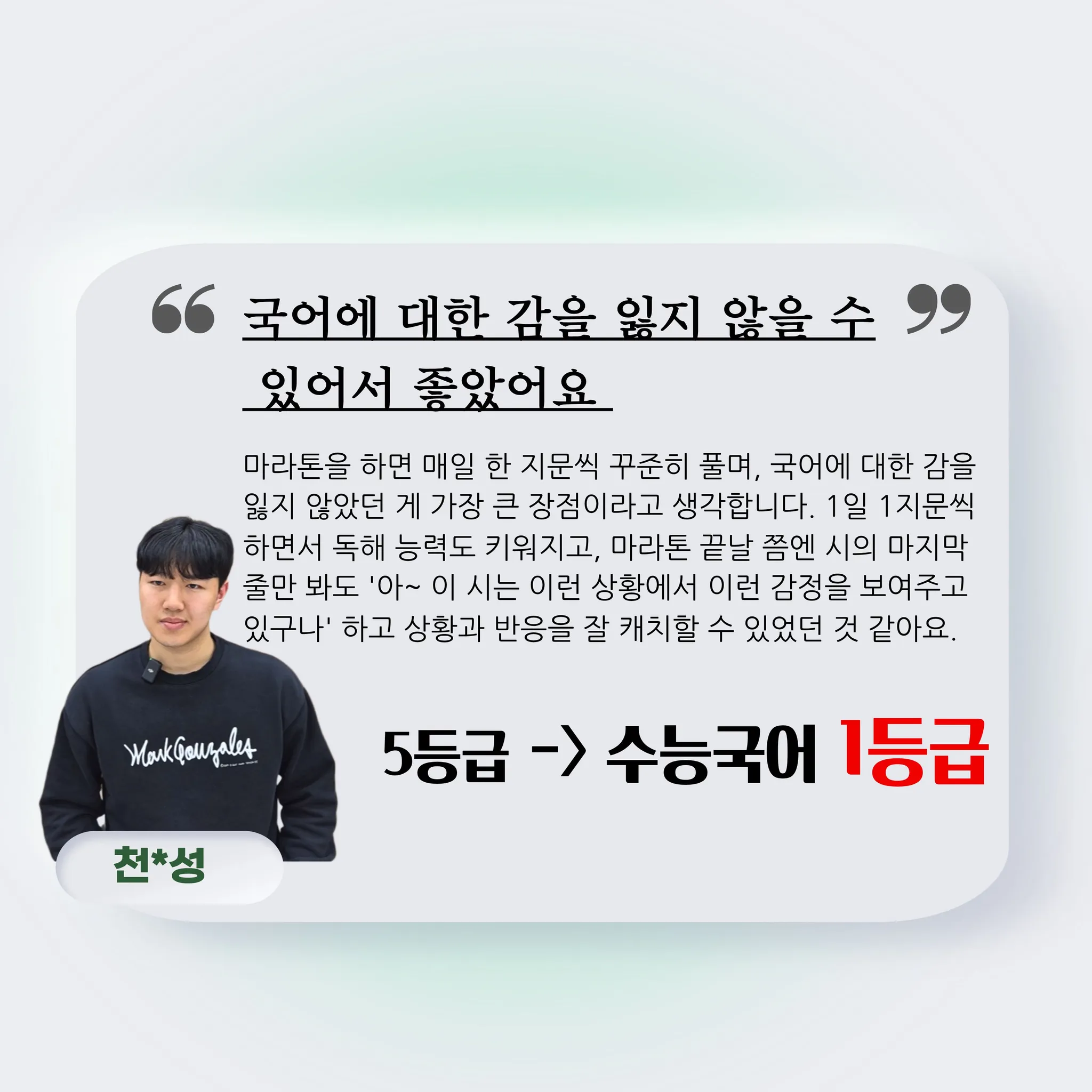 ■ 성적 : 9모 5등급에서 수능국어 1등급 달성