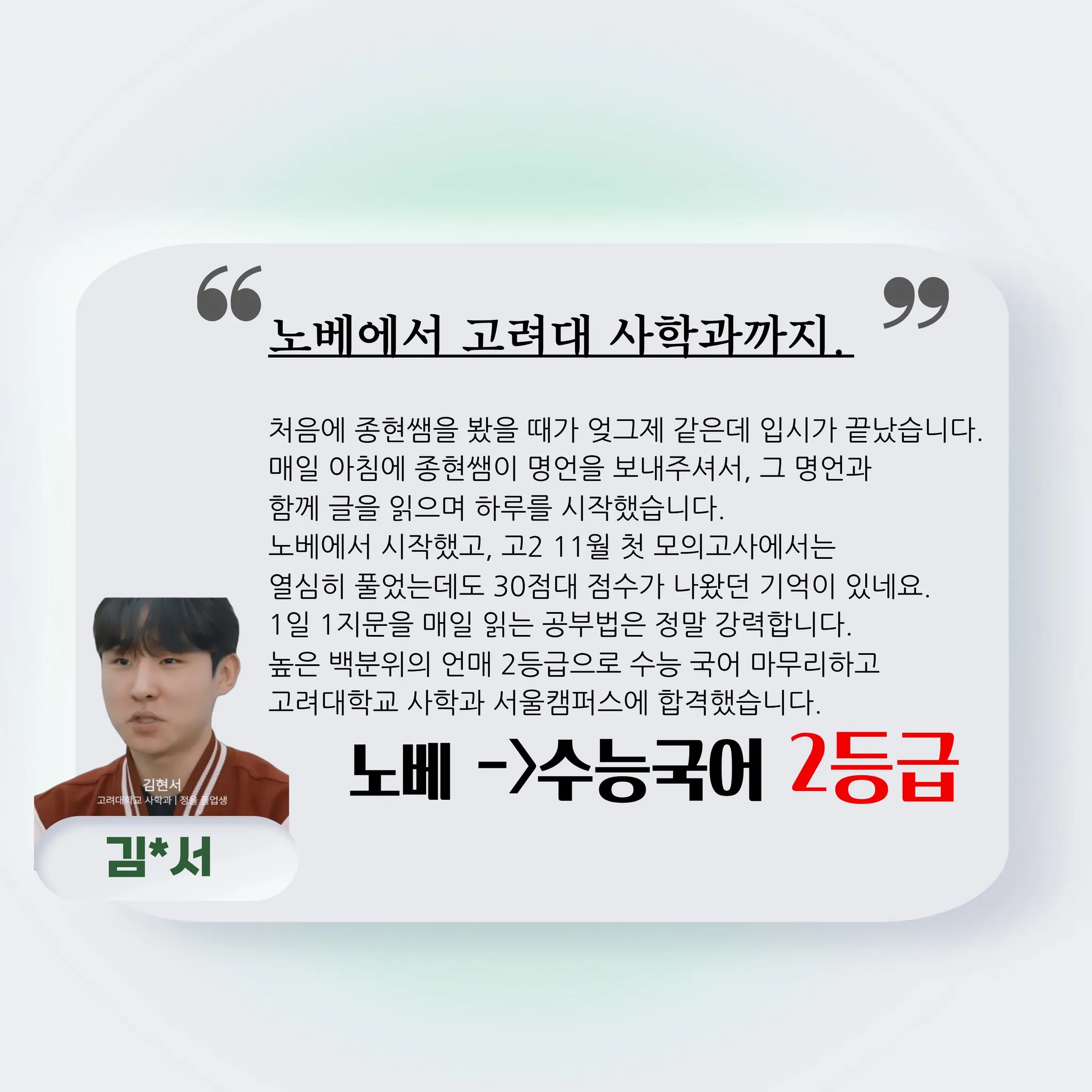 처음에 종현쌤을 봤을 때가 엊그제 같은데 입시가 끝났습니다. 매일 아침에 종현쌤이 명언을 보내주셔서, 그 명언과 함께 글을 읽으며 하루를 시작했습니다. 노베에서 시작했고, 고2 11월 첫 모의고사에서는 열심히 풀었는데도 30점대 점수가 나왔던 기억이 있네요.