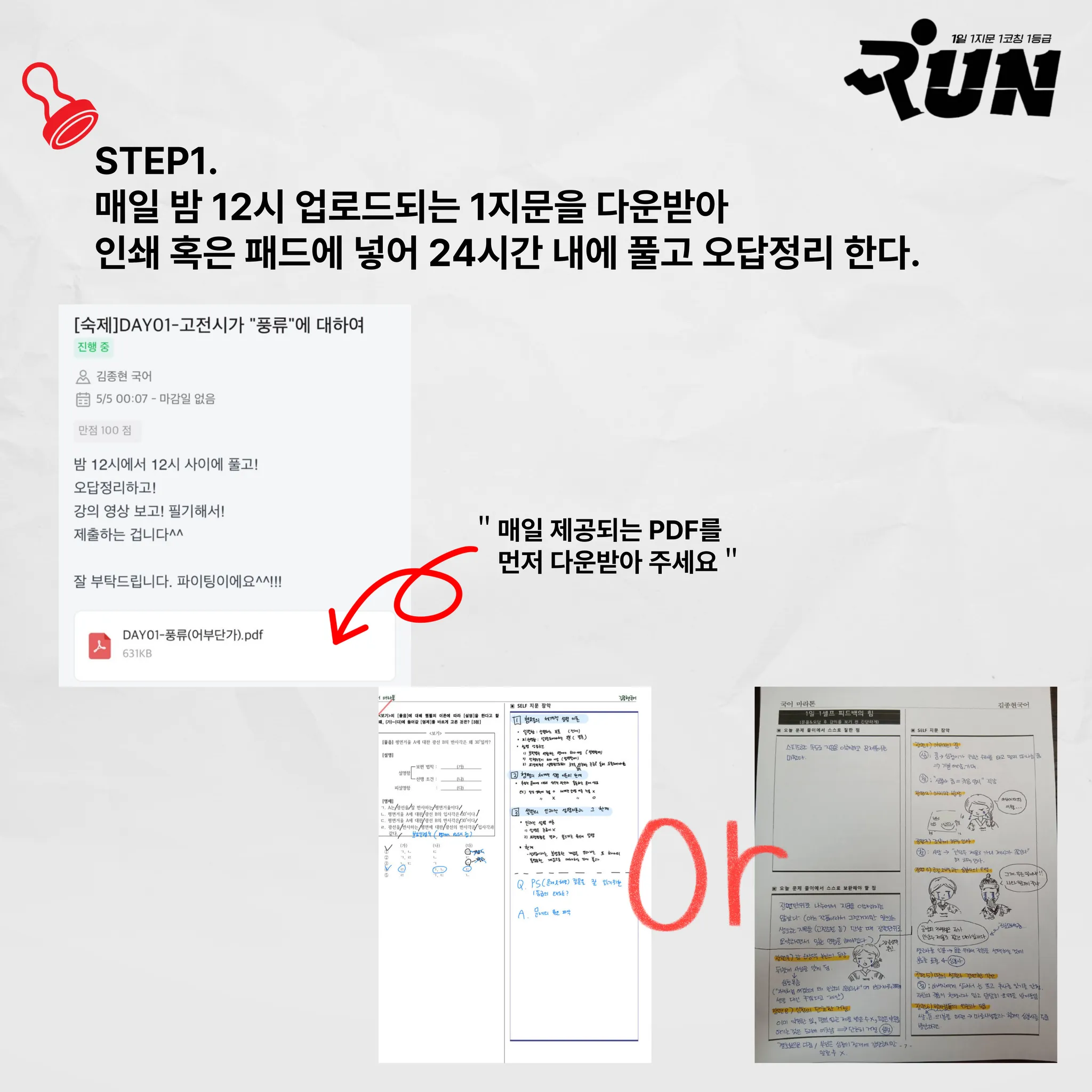 하루 1개의 국어 지문을 풀고, 종현쌤에게 직접 코칭을 받는 구조입니다.