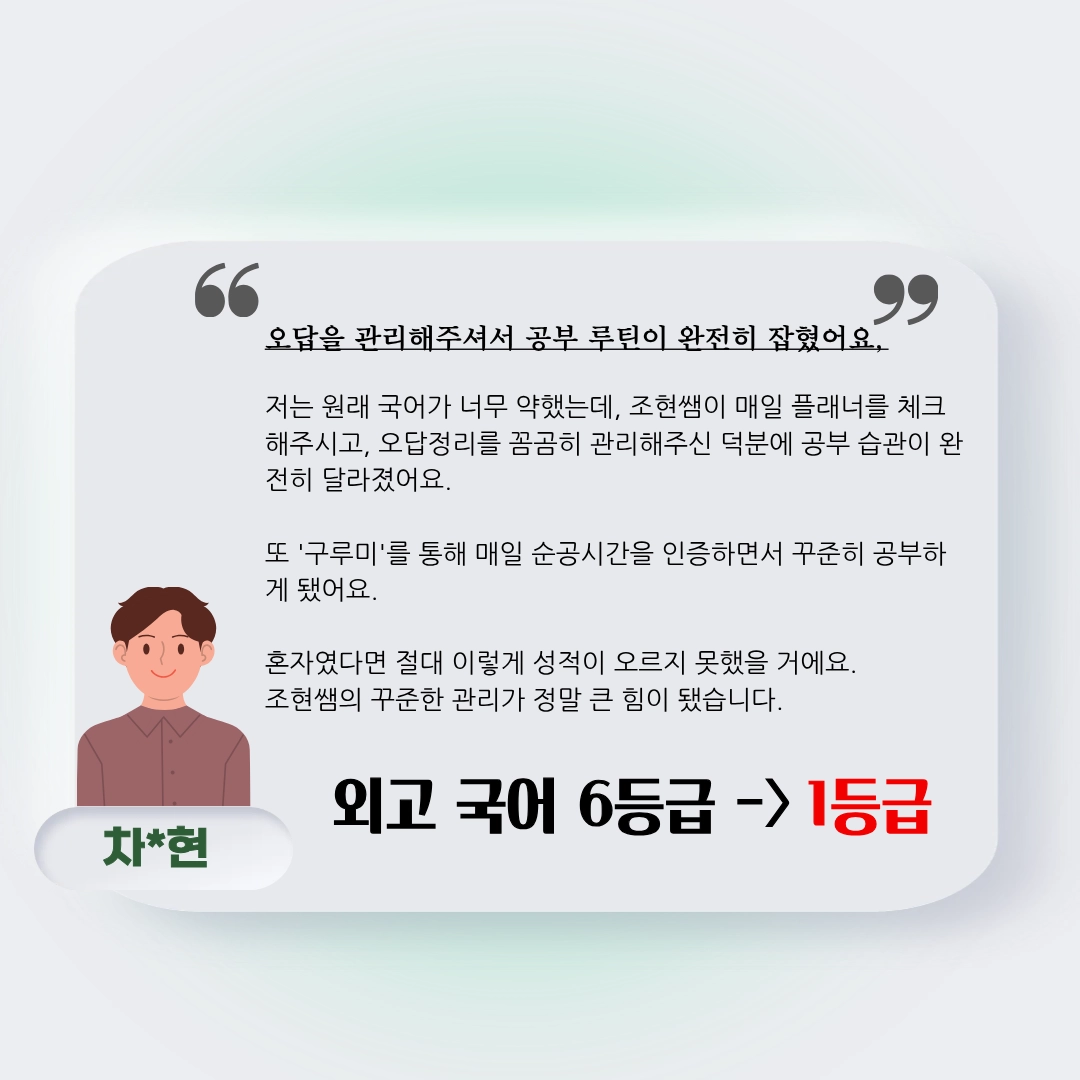저는 원래 국어가 너무 약했는데, 조현쌤이 매일 플래너를 체크해주시고, 오답정리를 꼼곰히 관리해주신 덕분에 공부 습관이 완전히 달라졌어요.