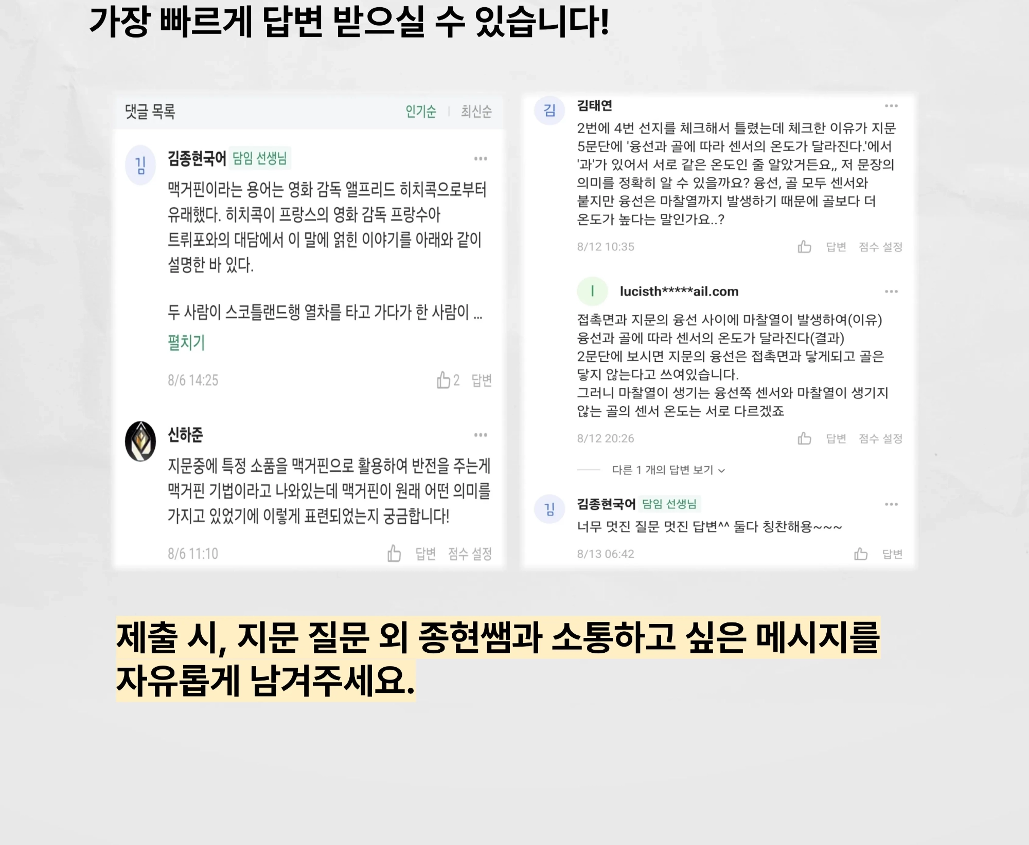 제출 시, 지문 질문 외 종현쌤과 소통하고 싶은 메시지를 자유롭게 남겨주세요.