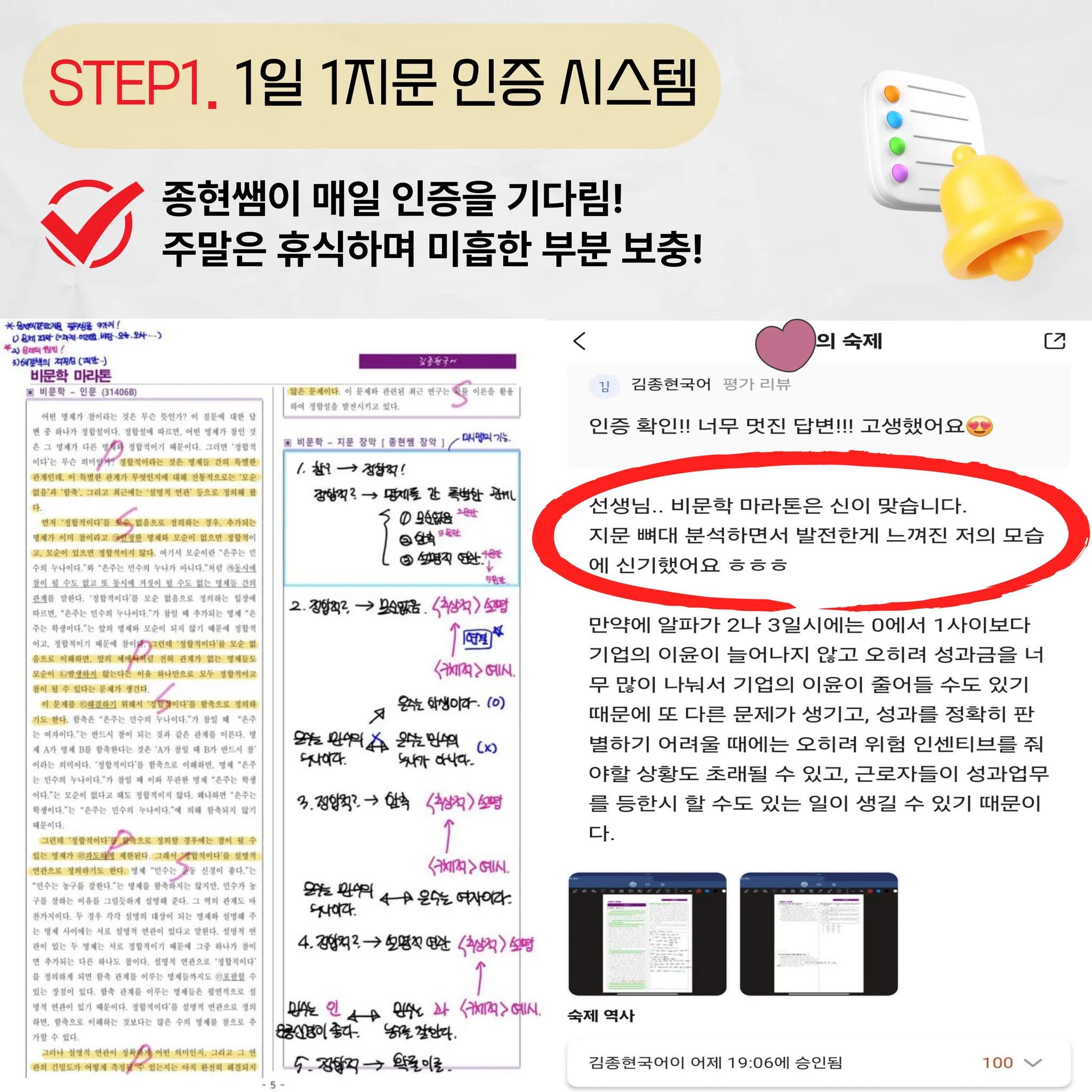 제가 푸는 것이 맞는 풀이인지, 선생님의 15분 동영상을 보니까 그걸 보면서 점검할 수 있었던 것이 좋았고, 지문이나 내용에서 중요 내용들만 선생님서 내용 정리도 해주시고, 어떻게 풀어야 하는지 풀이 방법도 알려주셔서 좋았습니다. 특히 지문을 풀고 제출하면 종현쌤이 피드백을 해주시는데 동기부여도 되고 꾸준히 인증하는 것이 도움이 되었어요!