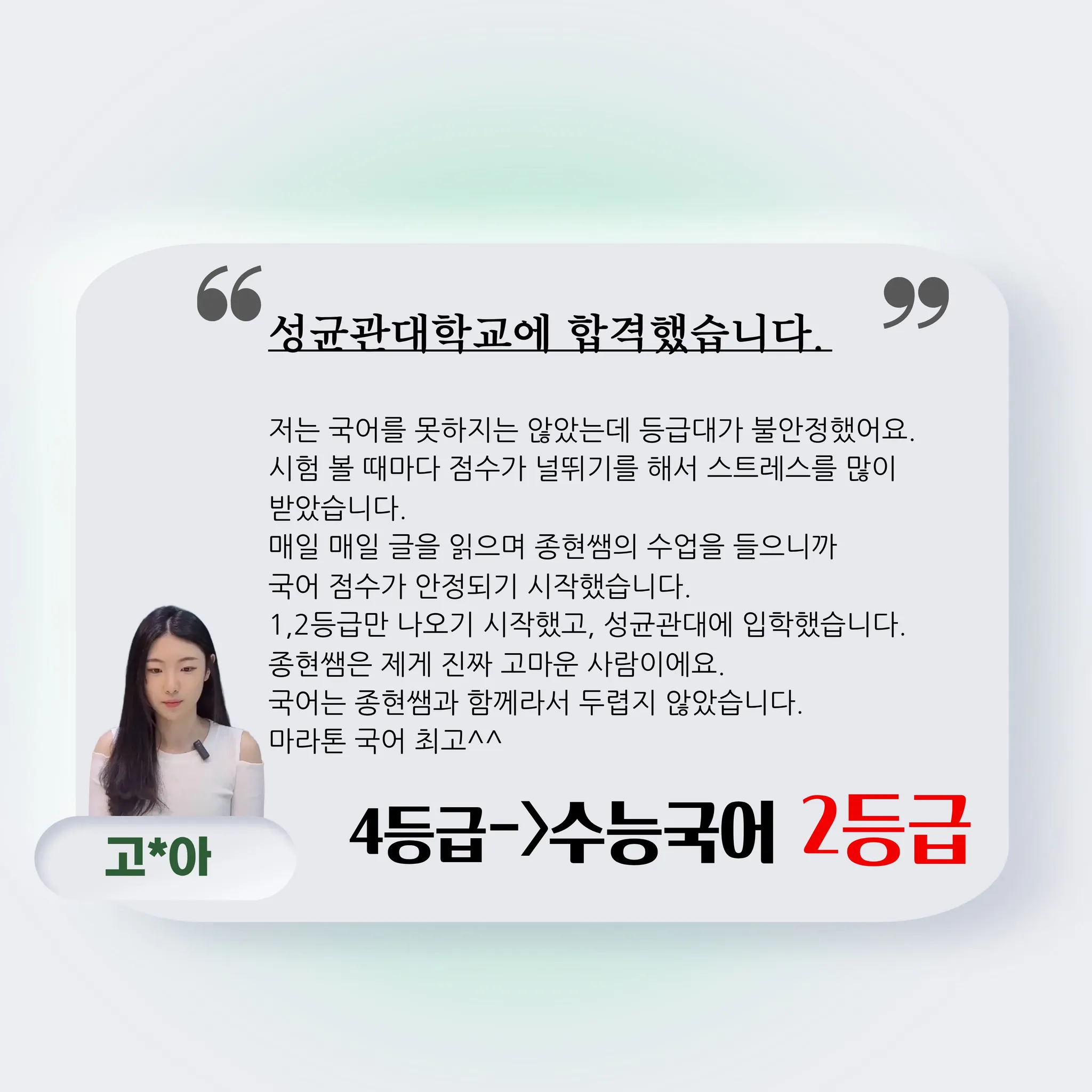 ■ 성적 : 3모 4등급에서 수능국어 2등급 달성 → 성균관대학교 진학