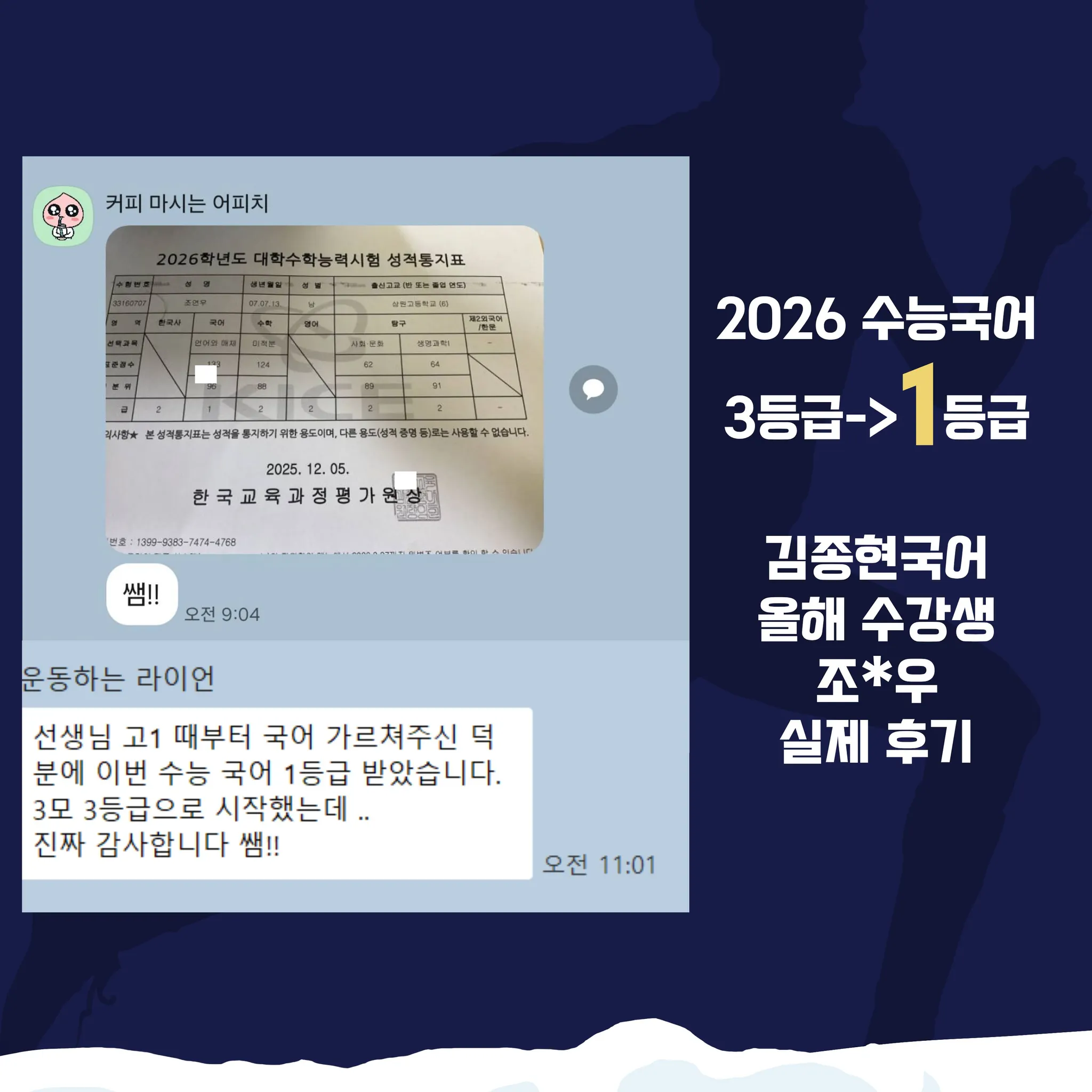 저는 중3때부터 종현쌤의 마라톤 국어 팀에서 국어를 공부한 조**우라고 합니다. 종현쌤, 조현쌤의 도움으로 고3 수능 국어 언매 1등급을 달성했어요.