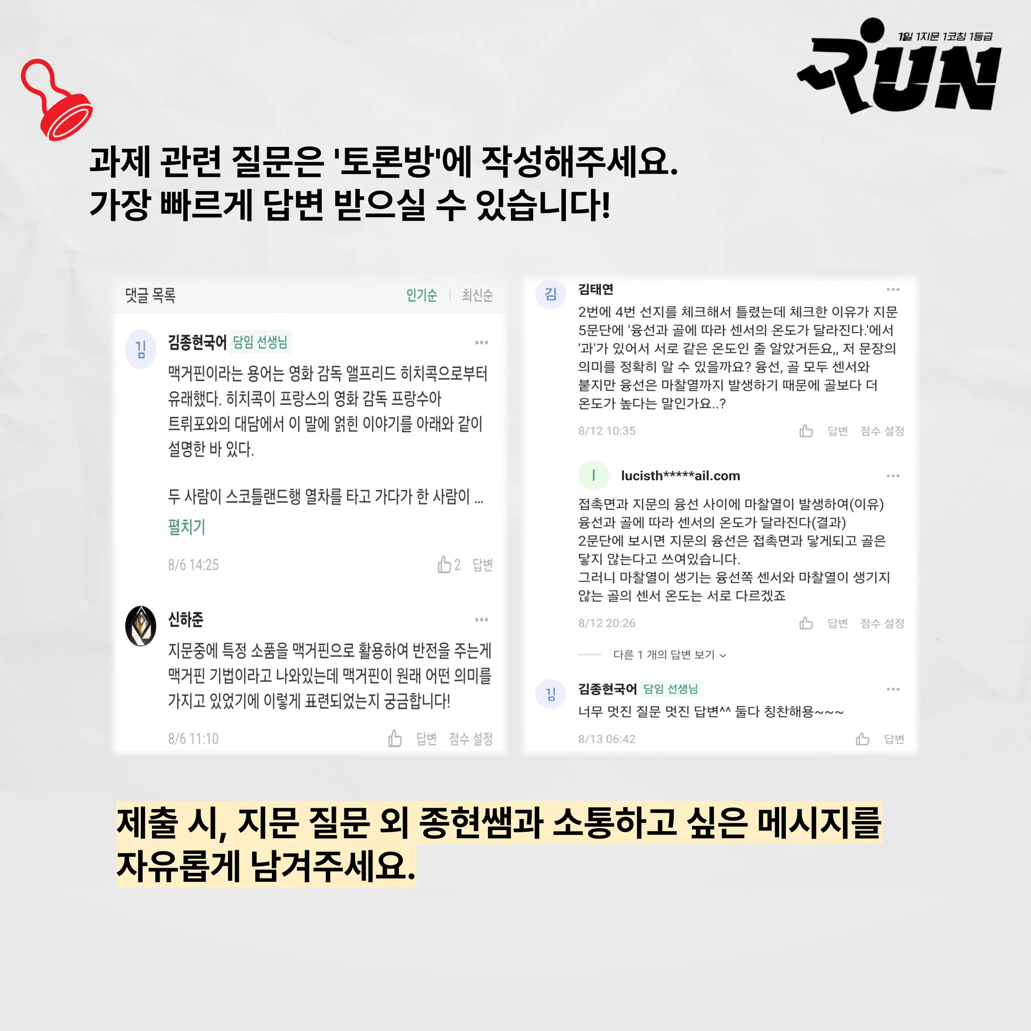 제출 시, 지문 질문 외 종현쌤과 소통하고 싶은 메시지를 자유롭게 남겨주세요.